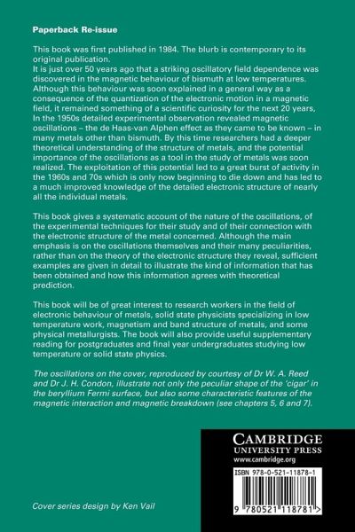 It is just over 80 years ago that a striking oscillatory field dependence was discovered in the magnetic behaviour of bismuth at low temperatures. This book was first published in 1984 and gives a systematic account of the nature of the oscillations, of the experimental techniques for their study and of their connection with the electronic structure of the metal concerned.