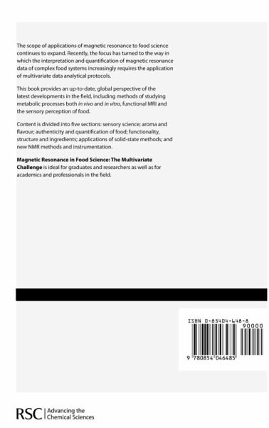 The scope of applications of magnetic resonance to food science continues to expand. Recently, the focus has turned to the way in which the interpretation and quantification of magnetic resonance data of complex food systems increasingly requires the application of multivariate data analytical protocols. This book provides an up-to-date, global perspective of the latest developments in the field, including methods of studying metabolic processes both in vivo and in vitro, functional MRI and the sensory perception of food. Content is divided into five sections: sensory science; aroma and flavour; authenticity and quantification of food; functionality, structure and ingredients; applications of solid-state methods; and new NMR methods and instrumentation. Magnetic Resonance in Food Science: The Multivariate Challenge is ideal for graduates and researchers as well as for academics and professionals in the field.