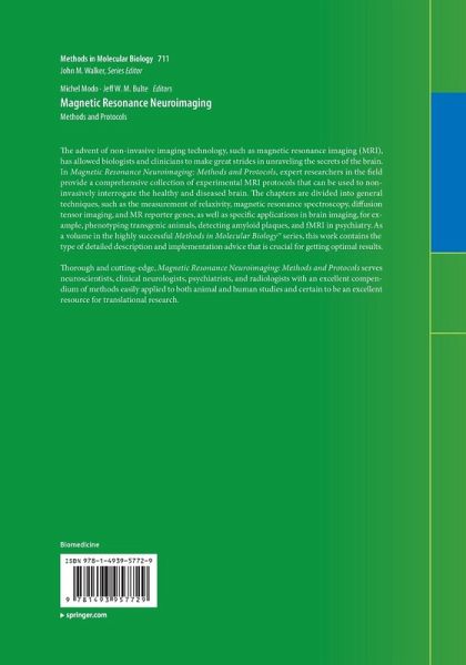 The advent of non-invasive imaging technology, such as magnetic resonance imaging (MRI), has allowed biologists and clinicians to make great strides in unraveling the secrets of the brain. In Magnetic Resonance Neuroimaging: Methods and Protocols, expert researchers in the field provide a comprehensive collection of experimental MRI protocols that can be used to non-invasively interrogate the healthy and diseased brain. The chapters are divided into general techniques, such as the measurement of relaxivity, magnetic resonance spectroscopy, diffusion tensor imaging, and MR reporter genes, as well as specific applications in brain imaging, for example, phenotyping transgenic animals, detecting amyloid plaques, and fMRI in psychiatry. As a volume in the highly successful Methods in Molecular Biology(TM) series, this work contains the type of detailed description and implementation advice that is crucial for getting optimal results.Thorough and cutting-edge, Magnetic Resonance Neuroimaging: Methods and Protocols serves neuroscientists, clinical neurologists, psychiatrists, and radiologists with an excellent compendium of methods easily applied to both animal and human studies and certain to be an excellent resource for translational research.
