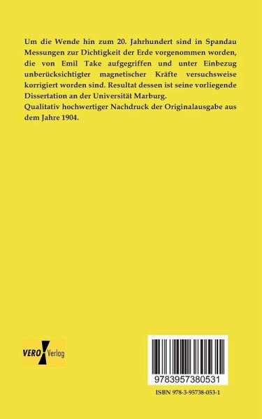 Um die Wende hin zum 20. Jahrhundert sind in Spandau Messungen zur Dichtigkeit der Erde vorgenommen worden, die von Emil Take aufgegriffen und unter Einbezug unberücksichtigter magnetischer Kräfte versuchsweise korrigiert worden sind. Resultat dessen ist seine vorliegende Dissertation an der Universität Marburg.