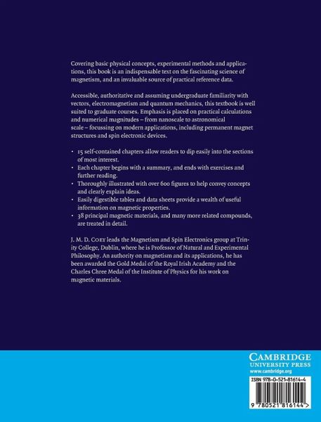 1. Introduction; 2. Magnetostatics; 3. Magnetism of electrons; 4. Magnetism of localized electrons on the atom; 5. Ferromagnetism and exchange; 6. Antiferromagnetism and other magnetic order; 7. Micromagnetism, domains and hysteresis; 8. Nanoscale magnetism; 9. Magnetic resonance; 10. Experimental methods; 11. Magnetic materials; 12. Applications of soft magnets; 13. Applications of hard magnets; 14. Spin electronics and magnetic recording; 15. Special topics; Appendixes; Index.