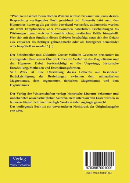 Der Schriftsteller und Okkultist Gustav Wilhelm Gessmann präsentiert im vorliegenden Band einen Überblick über die Verfahren des Magnetismus und der Hypnose. Dabei berücksichtigt er die Ursprünge, historische Entwicklung, Methoden und Erscheinungsformen.