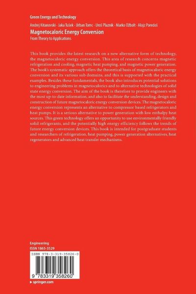 This book provides the latest research on a new alternative form of technology, the magnetocaloric energy conversion. This area of research concerns magnetic refrigeration and cooling, magnetic heat pumping and magnetic power generation. The book's systematic approach offers the theoretical basis of magnetocaloric energy conversion and its various sub domains and this is supported with the practical examples. Besides these fundamentals, the book also introduces potential solutions to engineering problems in magnetocalorics and to alternative technologies of solid state energy conversion. The aim of the book is therefore to provide engineers with the most up-to-date information and also to facilitate the understanding, design and construction of future magnetocaloric energy conversion devices. The magnetocaloric energy conversion represents an alternative to compressor based refrigerators and heat pumps. It is a serious alternative to power generation with low enthalpy heat sources. This green technology offers an opportunity to use environmentally friendly solid refrigerants and the potentially high energy efficiency follows the trends of future energy conversion devices. This book is intended for postgraduate students and researchers of refrigeration, heat pumping, power generation alternatives, heat regenerators and advanced heat transfer mechanisms.