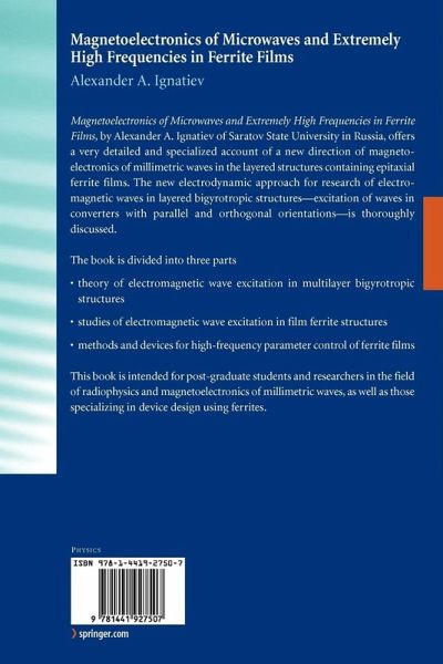 Magnetoelectronics of Microwaves and Extremely High Frequencies in Ferrite Films, by Alexander A. Ignatiev of Saratov State University in Russia, offers a very detailed and specialized account of a new direction of magnetoelectronics of millimetric waves in the layered structures containing epitaxial ferrite films. The new electrodynamic approach for research of electromagnetic waves in layered bigyrotropic structures - excitation of waves in converters with parallel and orthogonal orientations - is thoroughly discussed.