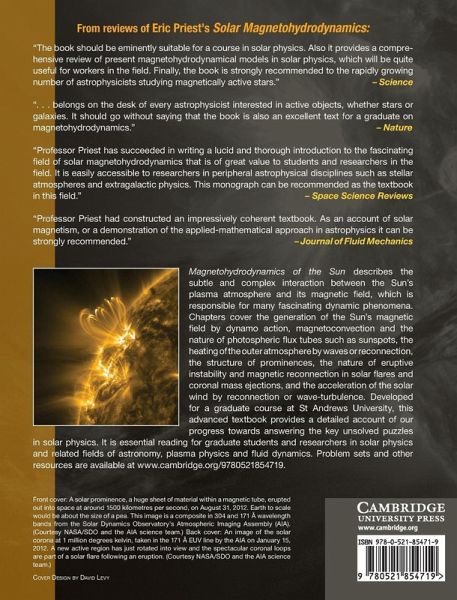 Magnetohydrodynamics of the Sun is a completely new up-to-date rewrite from scratch of the 1982 book Solar Magnetohydrodynamics, taking account of enormous advances in understanding since that date. It describes the subtle and complex interaction between the Sun's plasma atmosphere and its magnetic field, which is responsible for many fascinating dynamic phenomena. Chapters cover the generation of the Sun's magnetic field by dynamo action, magnetoconvection and the nature of photospheric flux tubes such as sunspots, the heating of the outer atmosphere by waves or reconnection, the structure of prominences, the nature of eruptive instability and magnetic reconnection in solar flares and coronal mass ejections, and the acceleration of the solar wind by reconnection or wave-turbulence. It is essential reading for graduate students and researchers in solar physics and related fields of astronomy, plasma physics and fluid dynamics. Problem sets and other resources are available at www.cambridge.org/9780521854719.