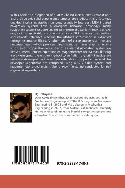 In this book, the integration of a MEMS based inertial measurement unit and a three axis solid state magnetometer are studied. It is a fact that unaided inertial navigation systems, especially low cost MEMS based navigation systems have a divergent behavior. Nowadays, many navigation systems use GPS aiding to improve the performance, but GPS may not be applicable in some cases. Also, GPS provides the position and velocity reference whereas the attitude information is extracted through estimation filters. An alternative reference source is a three axis magnetometer, which provides direct attitude measurements. In this study, error propagation equations of an inertial navigation system are derived; measurement equations of magnetometer for Kalman filtering are v developed; the unique method to self align the MEMS navigation system is developed. In the motion estimation, the performance of the developed algorithms are compared using a GPS aided system and magnetometer aided system. Some experiments are conducted for self alignment algorithms.