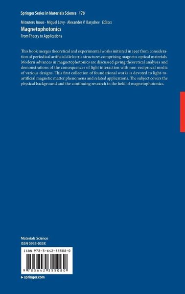 Theoretical analysis of mechanisms of faraday rotation enhancement.- All-garnet magnetophotonic crystals.- One-dimensional helicoidal magnetophotonic crystals and multifaceted tunability of photonic bandgaps.- Electromagnetic unidirectionality in magnetic photonic crystals.- Bigyrotropic magnetic photonic crystals.- Magnetooptics in plasmonic crystals.- Magnetophotonic Bragg waveguides, waveguide arrays and nonreciprocal Bloch oscillations.- Magnetophotonic crystals: experimental realization and applications.- Nonlinear magneto-optics in magnetophotonic crystals and nanostructures.- Magnetorefractive effect in magnetic nanostructures, manganites and magnetophotonic crystals.
