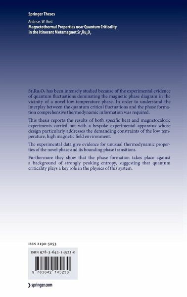 Our department nominated this thesis for a Springer award because we regard it as an outstanding piece of work, carried out with a remarkable level of independence. Andreas Rost joined us in 2005, as one of the inaugural Prize Students of the Scottish Universities Physics Alliance. Our research group has been working on Sr Ru O , in collaboration with our colleagues in the group of Professor Y. Maeno 3 2 7 at Kyoto, since 1998. By early 2005 we had tantalising evidence that a novel phase was forming at very low temperatures, in an overall phase diagram dominated by quantum ?uctuations. We knew that comprehensive thermodynamic information would be needed in order to understand how this was happening, and that the demanding constraints of low temperature and high magnetic ?eld meant that bespoke apparatus would need to be constructed. Andreas had studied the speci?c heat of glasses below 50 mK during his diploma thesis work at Heidelberg, and was brimming with ideas about how to proceed. We gave him advice, and constantly discussed the physics with him, but quickly realised that the best way to proceed practically was to give him a budget, and let him take the main design decisions, double-checking with us from time to time.