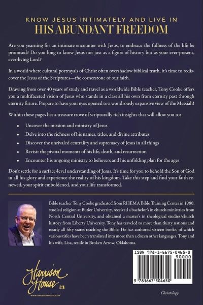 Know Jesus Intimately and Live In His Abundant Freedom Are you yearning for an intimate encounter with Jesus, to embrace the fullness of the life he promised? Do you long to know Jesus not just as a figure of history but as your ever-present, ever-living Lord? In a world where cultural portrayals of Christ often overshadow biblical truth, it's time to rediscover the Jesus of the Scriptures-the cornerstone of our faith. Drawing from over 40 years of study and travel as a worldwide Bible teacher, Tony Cooke offers you a multifaceted vision of Jesus who stands in a class all his own from eternity past through eternity future. Prepare to have your eyes opened to a wondrously expansive view of the Messiah! Within these pages lies a treasure trove of scripturally rich insights that will allow you to: Uncover the mission and ministry of Jesus Delve into the richness of his names, titles, and divine attributes Discover the unrivaled centrality and supremacy of Jesus in all things Revisit the pivotal moments of his life, death, and resurrection Encounter his ongoing ministry to believers and his unfolding plan for the ages Don't settle for a surface-level understanding of Jesus. It's time for you to behold the Son of God in all his glory and experience the reality of his kingdom. Take this step and find your faith renewed, your spirit emboldened, and your life transformed.