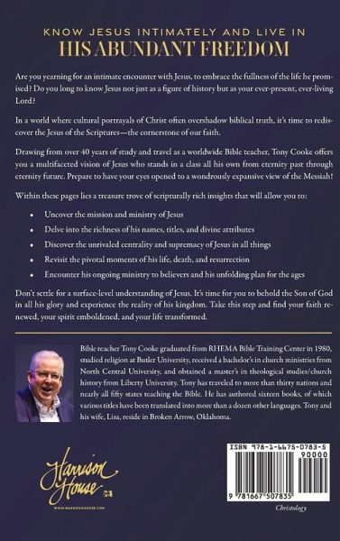 Know Jesus Intimately and Live In His Abundant Freedom Are you yearning for an intimate encounter with Jesus, to embrace the fullness of the life he promised? Do you long to know Jesus not just as a figure of history but as your ever-present, ever-living Lord? In a world where cultural portrayals of Christ often overshadow biblical truth, it's time to rediscover the Jesus of the Scriptures-the cornerstone of our faith. Drawing from over 40 years of study and travel as a worldwide Bible teacher, Tony Cooke offers you a multifaceted vision of Jesus who stands in a class all his own from eternity past through eternity future. Prepare to have your eyes opened to a wondrously expansive view of the Messiah! Within these pages lies a treasure trove of scripturally rich insights that will allow you to: Uncover the mission and ministry of Jesus Delve into the richness of his names, titles, and divine attributesDiscover the unrivaled centrality and supremacy of Jesus in all thingsRevisit the pivotal moments of his life, death, and resurrectionEncounter his ongoing ministry to believers and his unfolding plan for the ages Don't settle for a surface-level understanding of Jesus. It's time for you to behold the Son of God in all his glory and experience the reality of his kingdom. Take this step and find your faith renewed, your spirit emboldened, and your life transformed.