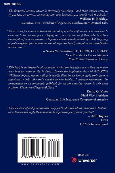 "The financial services career is extremely rewarding-and these women prove it. If you have an interest in coming into this business, you should read this book!" -William H. Beckley,Executive Vice President of Agencies, Northwestern Mutual Life. "There are so few women in this most rewarding of noble professions. Use this book to showcase to the women you are trying to recruit the stories of those who have been successful in financial services. They are motivating and captivating. And, they may be just enough for your prospective recruit to picture herself as a future successful leader in this career." -Susan W. Sweetser, JD, CFP®, CLU, ChFC, Vice President-Focus Markets, MassMutual Financial Group "This book is an inspirational testament to what the individual can achieve, no matter your level or tenure in the business. Beyond the inspiration these 14 AMAZING WOMEN impart, readers will gain specific direction on how to apply their years of experience to help take their practice to new heights. I strongly recommend this compendium as an invaluable guidebook for all the amazing women in this great business. Thank you Ginger and Diane!" -Emily G. Viner, Field Vice President, Guardian Life Insurance Company of America "This is a book of best practices that every field leader and advisor must read! Embrace these lessons and apply them to immediately enrich your firm or practice!" -Jeff Hughes,CEO, GAMA International