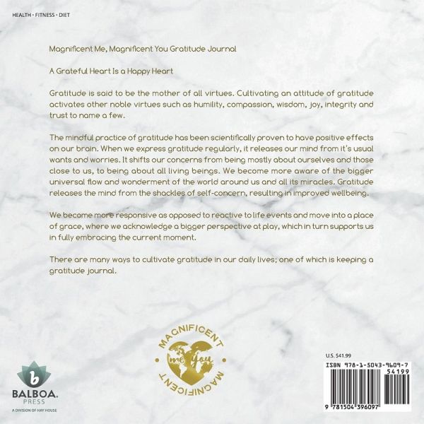 Magnificent Me, Magnificent You Gratitude Journal A Grateful Heart Is a Happy Heart Gratitude is said to be the mother of all virtues. Cultivating an attitude of gratitude activates other noble virtues such as humility, compassion, wisdom, joy, integrity and trust to name a few. The mindful practice of gratitude has been scientifically proven to have positive effects on our brain. When we express gratitude regularly, it releases our mind from its usual wants and worries. It shifts our concerns from being mostly about ourselves and those close to us, to being about all living beings. We become more aware of the bigger universal flow and wonderment of the world around us and all its miracles. Gratitude releases the mind from the shackles of self-concern, resulting in improved wellbeing. We become more responsive as opposed to reactive to life events and move into a place of grace, where we acknowledge a bigger perspective at play, which in turn supports us in fully embracing the current moment. There are many ways to cultivate gratitude in our daily lives; one of which is keeping a gratitude journal.