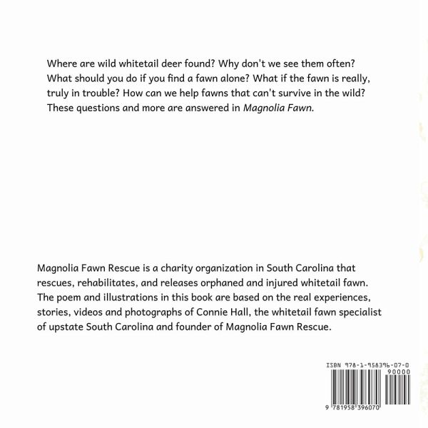 This beautifully illustrated picture book tells the true story of how wild whitetail deer are rescued and rehabilitated by Magnolia Fawn Rescue, in poetic form. Magnolia Fawn Rescue is a small, rural charity that takes in orphaned and injured whitetail deer fawns and rehabilitates and releases them into the wild, as well as operating a sanctuary for disabled and confiscated "pet" deer. The pictures and poem describe the real experiences of Connie Hall, whitetail fawn specialist of upstate South Carolina and founder of Magnolia Fawn Rescue. The richly textured, painterly illustrations are combined with advanced vocabulary in a poetic format that doesn't talk down to children, making this book engaging and challenging for all reading levels.