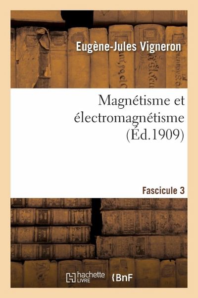 Magnétisme et électromagnétisme.... Fascicule 3 / par Eug. Vigneron, ... Date de l'édition originale: 1909 Le présent ouvrage s'inscrit dans une politique de conservation patrimoniale des ouvrages de la littérature Française mise en place avec la BNF. HACHETTE LIVRE et la BNF proposent ainsi un catalogue de titres indisponibles, la BNF ayant numérisé ces oeuvres et HACHETTE LIVRE les imprimant à la demande. Certains de ces ouvrages reflètent des courants de pensée caractéristiques de leur époque, mais qui seraient aujourd'hui jugés condamnables. Ils n'en appartiennent pas moins à l'histoire des idées en France et sont susceptibles de présenter un intérêt scientifique ou historique. Le sens de notre démarche éditoriale consiste ainsi à permettre l'accès à ces oeuvres sans pour autant que nous en cautionnions en aucune façon le contenu. Pour plus d'informations, rendez-vous sur www.hachettebnf.fr