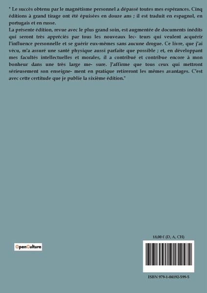 " Le succès obtenu par le magnétisme personnel a dépassé toutes mes espérances. Cinq éditions à grand tirage ont été épuisées en douze ans ; il est traduit en espagnol, en portugais et en russe. La présente édition, revue avec le plus grand soin, est augmentée de documents inédits qui seront très appréciés par tous les nouveaux lec- teurs qui veulent acquérir l'influence personnelle et se guérir eux-mêmes sans aucune drogue. Ce livre, que j'ai vécu, m'a assuré une santé physique aussi parfaite que possible ; et, en développant mes facultés intellectuelles et morales, il a contribué et contribue encore à mon bonheur dans une très large me- sure. J'affirme que tous ceux qui mettront sérieusement son enseigne- ment en pratique retireront les mêmes avantages. C'est avec cette certitude que je publie la sixième édition."