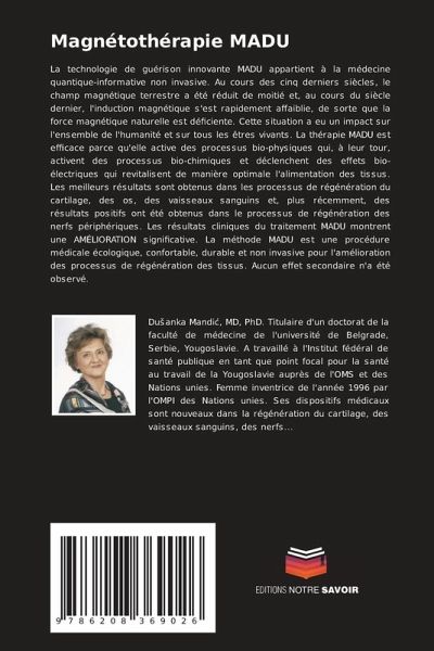 La technologie de guérison innovante MADU appartient à la médecine quantique-informative non invasive. Au cours des cinq derniers siècles, le champ magnétique terrestre a été réduit de moitié et, au cours du siècle dernier, l'induction magnétique s'est rapidement affaiblie, de sorte que la force magnétique naturelle est déficiente. Cette situation a eu un impact sur l'ensemble de l'humanité et sur tous les êtres vivants. La thérapie MADU est efficace parce qu'elle active des processus bio-physiques qui, à leur tour, activent des processus bio-chimiques et déclenchent des effets bio-électriques qui revitalisent de manière optimale l'alimentation des tissus. Les meilleurs résultats sont obtenus dans les processus de régénération du cartilage, des os, des vaisseaux sanguins et, plus récemment, des résultats positifs ont été obtenus dans le processus de régénération des nerfs périphériques. Les résultats cliniques du traitement MADU montrent une AMÉLIORATION significative. La méthode MADU est une procédure médicale écologique, confortable, durable et non invasive pour l'amélioration des processus de régénération des tissus. Aucun effet secondaire n'a été observé.