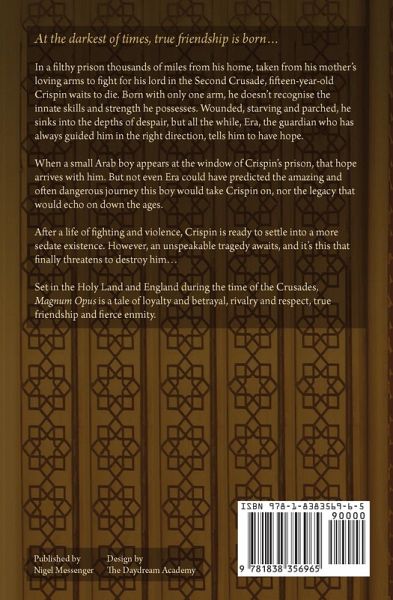 A young English boy of 15 is a valet to his overlord and travels with him and his knights on a pilgrimage to the Holy Land, joining thousands of other Europeans to regain ground lost to the Saracens. This venture became known as the Second Crusade. He saves the life of Eleanor of Aquitaine, who at that time was travelling with her armies, together with her first husband, the King of France. Later, after an ill-advised crusader attack on the city of Damascus, which ended in their defeat, the boy is wounded, captured by the Muslims and thrown into a dingy prison cell. Eventually, he is rescued by an 11-year-old Muslim boy, who eventually becomes the greatest leader of the Muslim world, Saladin. He and the English boy, Crispin, become firm friends. He becomes a trusted assistant to Saladin and accompanies him during his many adventures and wars to unite the Arab nations. Crispin runs the pigeon communication services, which are essential to Saladin's objectives. During these years, Crispin marries Yasmine, and they start a family. For over 40 years they create a magnificent book with beautiful paintings, which details their life experiences and encompasses the history of their times. This is their Magnum Opus. Many years later, King Richard the first arrives and leads a terrible campaign to defeat the Muslims and regain control of the holy city of Jerusalem. At the conclusion Crispin has an opportunity to return home, but deeply regrets the decision he made. Crispin had been born with just one arm........