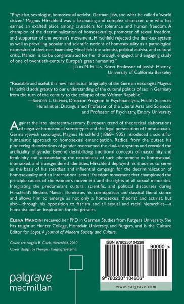 "Physician, sexologist, homosexual activist, German, Jew, and what he called, a world citizen, Magnus Hirschfeld was a fascinating and complex character, one who has earned an exalted place among crusaders for tolerance and human freedom. A champion of the decriminalization of homosexuality, promoter of sexual freedom, and supporter of the women s movement, Hirschfeld rejected the dual sex system as well as prevailing popular and scientific notions of homosexuality as a pathological expression of deviance. Examining Hirschfeld the scientist, political activist, and cultural critic, Mancini is to be congratulated for her thorough, engaged, and engaging study of one of twentieth-century Europe s great humanists." - John M. Efron, Koret Professor of Jewish History, University of California-Berkeley