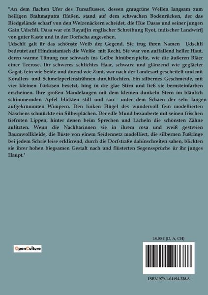 "An dem flachen Ufer des Tursaflusses, dessen graugrüne Wellen langsam zum heiligen Brahmaputra fließen, stand auf dem schwachen Bodenrücken, der das Riedgelände scharf von den Weizenäckern scheidet, die Hüe Dasas und seiner jungen Gain Udschli. Dasa war ein Rayat[in englischer Schreibung Ryot, indischer Landwirt] von guter Kaste und in der Dorfscha angesehen. Udschli galt ür das schönste Weib der Gegend. Sie trug ihren Namen Udschli bedeutet auf Hindustanisch die Weiße mit Recht. Sie war von auffallend heller Haut, deren warme Tönung nur schwach ins Gelbe hinüberspielte, wie die äußeren Bläer einer Teerose. Ihr schweres schlichtes Haar, schwarz und glänzend wie gegläeter Gagat, fein wie Seide und duend wie Zimt, war nach der Landesart gescheitelt und mit Korallen- und Schmelzperlensträhnen durchflochten. Ein silbernes Geschmeide, mit vier kleinen Türkisen besetzt, hing in die glae Stirn und ließ sie bernsteinfarben erscheinen. Ihre großen Mandelaugen mit dem kleinen dunkeln Stern im bläulich schimmernden Apfel blickten still und san¿ unter dem Schaen der sehr langen aufgekrümmten Wimpern. Den linken Flügel des wundervoll fein modellierten Näschens schmückte ein Silberplächen. Der edle Mund bezauberte mit seinen frischen tiefroten Lippen, hinter denen beim Sprechen und Lächeln die schönsten Zähne aulitzten. Wenn die Nachbarinnen sie in ihrem rosa und weiß gestreien Baumwollkleide, die Büste von einem Seidennetz modelliert, die silbernen Fußringe bei jedem Schrie leise erklirrend, durch die Dorfstraße dahinschreiten sahen, blickten sie ihrer hohen biegsamen Gestalt nach und flüsterten Segenssprüche ür ihr junges Haupt."
