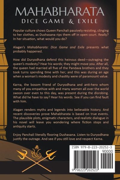 Popular culture shows Queen Panchali passively resisting, clinging to her clothes, as Dushasana rips them off in open court. Really? In her situation, what would you do? Yes, that's what Alagan portrays in his novel. How did Duryodhana defend this heinous deed-outraging the queen's modesty? Hear his words; they might move you. After all, the queen had married all five of the Pandava brothers and they took turns spending time with her; and this was during an age when a woman's modesty and chastity were of paramount value. Karna, the bosom friend of Duryodhana and anti-hero whom many of you…mehr
