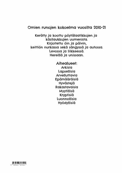 Runokokoelma pöytälaatikkojen ja käsilaukkujen uumenista. Kirjoitettu öin ja päivin, keittiön nurkassa sekä sängyssä ja autossa. Levossa ja liikkeessä.