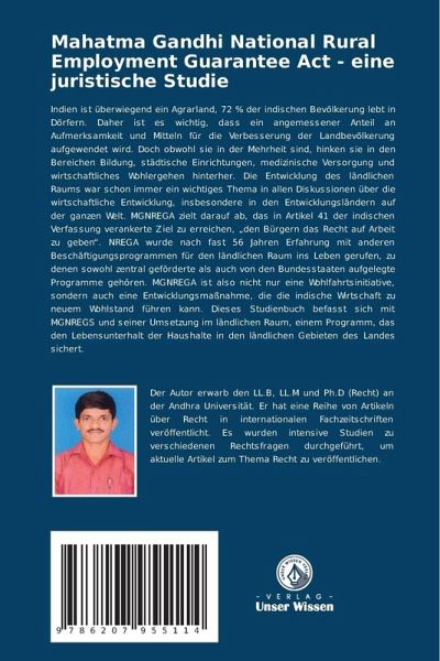 Indien ist überwiegend ein Agrarland, 72 % der indischen Bevölkerung lebt in Dörfern. Daher ist es wichtig, dass ein angemessener Anteil an Aufmerksamkeit und Mitteln für die Verbesserung der Landbevölkerung aufgewendet wird. Doch obwohl sie in der Mehrheit sind, hinken sie in den Bereichen Bildung, städtische Einrichtungen, medizinische Versorgung und wirtschaftliches Wohlergehen hinterher. Die Entwicklung des ländlichen Raums war schon immer ein wichtiges Thema in allen Diskussionen über die wirtschaftliche Entwicklung, insbesondere in den Entwicklungsländern auf der ganzen Welt. MGNREGA zielt darauf ab, das in Artikel 41 der indischen Verfassung verankerte Ziel zu erreichen, "den Bürgern das Recht auf Arbeit zu geben". NREGA wurde nach fast 56 Jahren Erfahrung mit anderen Beschäftigungsprogrammen für den ländlichen Raum ins Leben gerufen, zu denen sowohl zentral geförderte als auch von den Bundesstaaten aufgelegte Programme gehören. MGNREGA ist also nicht nur eine Wohlfahrtsinitiative, sondern auch eine Entwicklungsmaßnahme, die die indische Wirtschaft zu neuem Wohlstand führen kann. Dieses Studienbuch befasst sich mit MGNREGS und seiner Umsetzung im ländlichen Raum, einem Programm, das den Lebensunterhalt der Haushalte in den ländlichen Gebieten des Landes sichert.