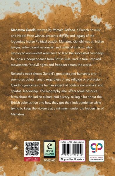 'Mahatma Gandhi' written by Romain Rolland, a French novelist and Nobel Prize winner, presents the life and legacy of the legendary Indian Political Leader. Mahatma Gandhi was an Indian lawyer, anti-colonial nationalist and political ethicist, who employed non-violent resistance to lead the successful campaign for India's independence from British Rule, and in turn, inspired movements for civil rights and freedom across the world. Rolland's book shows Gandhi's greatness and humanity and promotes being human, regardless of any religion or profession. Gandhi symbolizes the human aspect of politics and political and spiritual leadership. The biography also offers some historical facts about the Indian culture and history, telling a lot about the British colonization and how they got their independence while trying to keep the violence at a minimum under the leadership of Mahatma.