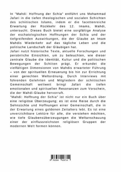 In "Mahdi: Hoffnung der Schia" entführt uns Mohammad Jafari in die tiefen theologischen und sozialen Schichten des schiitischen Islams, indem er die facettenreiche Erwartung der Rückkehr des 12. Imams, Mahdi, untersucht. Dieses Buch bietet eine sorgfältige Analyse der eschatologischen Hoffnungen der Schia und der tiefgreifenden Auswirkungen, die der Glaube an Imam Mahdis Wiederkehr auf das tägliche Leben und die politische Landschaft der Gläubigen hat.Jafari nutzt historische Texte, aktuelle Forschungen und persönliche Einsichten, um zu beleuchten, wie dieser zentrale Glaube die Identität, Kultur und die politischen Bewegungen der Schiiten prägt. Er erkundet die vielfältigen Dimensionen von Mahdis erwarteter Führung - von der spirituellen Erneuerung bis hin zur Errichtung einer gerechten Weltordnung. Durch Interviews mit führenden Gelehrten und Mitgliedern der schiitischen Gemeinschaft weltweit bringt Jafari die tiefen emotionalen und spirituellen Resonanzen zum Vorschein, die der Mahdi-Glaube hervorruft."Mahdi: Hoffnung der Schia" ist nicht nur ein Buch über eine religiöse Überzeugung; es ist eine Reise durch die Sehnsüchte und Hoffnungen einer Gemeinschaft, die in der Erwartung eines goldenen Zeitalters lebt. Es ist eine unverzichtbare Lektüre für alle, die verstehen möchten, wie tiefe Glaubensüberzeugungen die Weltanschauung einer der einflussreichsten religiösen Gruppen der modernen Welt formen können.