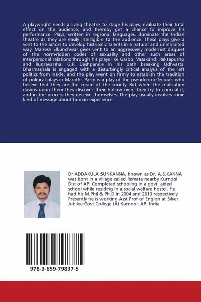 A playwright needs a living theatre to stage his plays, evaluate their total effect on the audience, and thereby get a chance to improve his performance. Plays, written in regional languages, dominate the Indian theatre as they are easily intelligible to the audience. These plays give a vent to the actors to develop histrionic talents in a natural and uninhibited way. Mahesh Elkunchwar gives vent to an aggressively modernist disquiet of the norm-ridden codes of sexuality and other such areas of interpersonal relations through his plays like Garbo, Vasakand, Raktapushp and Rudravarsha. G.P. Deshpande in his path breaking Udhvasta Dharmashala is engaged with a disturbingly critical analysis of the left politics from inside, and the play went on firmly to establish the tradition of political plays in Marathi. Party is a play of the pseudo-intellectuals who believe that they are the cream of the society. But when the realization dawns upon them they discover their hollow men, they try to conceal it, and in the process they deceive themselves. The play usually involves some kind of message about human experience.