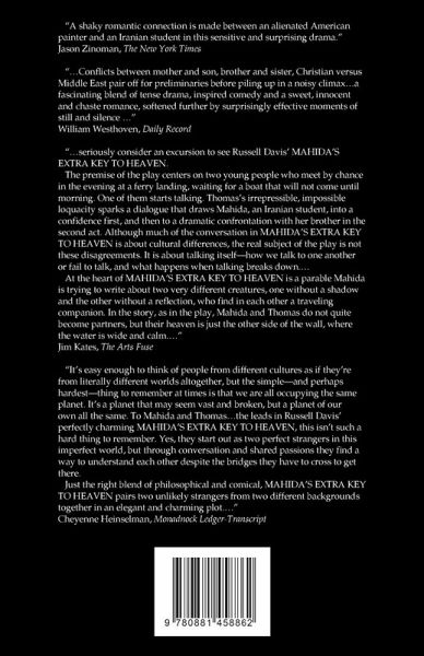 "A shaky romantic connection is made between an alienated American painter and an Iranian student in this sensitive and surprising drama." Jason Zinoman, The New York Times "…Conflicts between mother and son, brother and sister, Christian versus Middle East pair off for preliminaries before piling up in a noisy climax…a fascinating blend of tense drama, inspired comedy and a sweet, innocent and chaste romance, softened further by surprisingly effective moments of still and silence …" William Westhoven, Daily Record "…seriously consider an excursion to see Russell Davis' MAHIDA'S EXTRA KEY TO HEAVEN. The premise of the play centers on two young people who meet by chance in the evening at a ferry landing, waiting for a boat that will not come until morning. One of them starts talking. Thomas's irrepressible, impossible loquacity sparks a dialogue that draws Mahida, an Iranian student, into a confidence first, and then to a dramatic confrontation with her brother in the second act. Although much of the conversation in MAHIDA'S EXTRA KEY TO HEAVEN is about cultural differences, the real subject of the play is not these disagreements. It is about talking itself-how we talk to one another or fail to talk, and what happens when talking breaks down.… At the heart of MAHIDA'S EXTRA KEY TO HEAVEN is a parable Mahida is trying to write about two very different creatures, one without a shadow and the other without a reflection, who find in each other a traveling companion. In the story, as in the play, Mahida and Thomas do not quite become partners, but their heaven is just the other side of the wall, where the water is wide and calm.…" Jim Kates, The Arts Fuse "It's easy enough to think of people from different cultures as if they're from literally different worlds altogether, but the simple-and perhaps hardest-thing to remember at times is that we are all occupying the same planet. It's a planet that may seem vast and broken, but a planet of our own all the same. To Mahida and Thomas…the leads in Russell Davis' perfectly charming MAHIDA'S EXTRA KEY TO HEAVEN, this isn't such a hard thing to remember. Yes, they start out as two perfect strangers in this imperfect world, but through conversation and shared passions they find a way to understand each other despite the bridges they have to cross to get there. Just the right blend of philosophical and comical, MAHIDA'S EXTRA KEY TO HEAVEN pairs two unlikely strangers from two different backgrounds together in an elegant and charming plot.…" Cheyenne Heinselman, Monadnock Ledger-Transcript