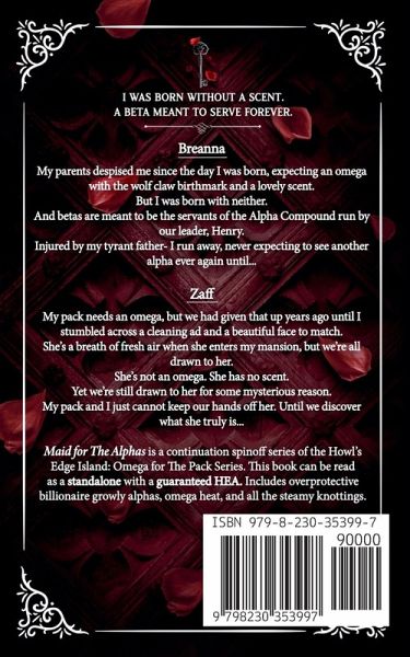 Born without a scent. A beta meant to serve forever. Breanna My parents despised me since the day I was born, expecting an omega with a lovely scent and a claw birthmark. But I was born with neither. Betas are meant to be the servants of the Alpha Compound run by our pack leader, Henry. Injured by my tyrant father- I run away, never expecting to see another alpha ever again until... Zaff My pack needs an omega, but we had given that up years ago until I stumbled across a cleaning ad and a beautiful face to match. She's a breath of fresh air when she enters my mansion, but we're all drawn to her. She's not an omega. She has no scent. Yet we're still drawn to her for some mysterious reason. My pack and I just cannot keep our hands off her. Until we discover what she truly is... Maid for The Alphas is a continuation spinoff series of the Howl's Edge Island: Omega for The Pack Series. This book can be read as a standalone with a guaranteed HEA. Includes overprotective billionaire growly alphas, omega heat and all the steamy knottings. ¿ Heat Level: Scorching (knotting, possessive growly alphas & omega heat) ¿ Pregnancy & Birth? Yes ¿ POV? First-Person Multiple POV ¿ No MM
