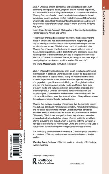 Maid in China is the first systematic, book-length investigation of internal rural migration in post-Mao China focused on the day-to-day production and consumption of popular media. Taking the rural maid in the urban home as its point of departure, the book weaves together three years of engaged ethnographic research in Beijing and Shanghai with critical analyses of a diverse array of popular media, and follows three lines of inquiry: media and cultural production, consumption practices, and everyday politics. It unravels some of the myriad ways in which the subaltern figure of the domestic worker comes to be inscribed with the cultural politics of boundaries that entrench a host of inequalities-between rich and poor, male and female, rural and urban. Wanning Sun explores a number of paradoxes that the domestic worker lives out on a daily basis: her ubiquitous invisibility, her enduring transience, and her status as an intimate stranger. Collectively, these paradoxes afford her a unique window onto the spaces and practices of the modern Chinese city. This intimate stranger's epistemological status makes her an unauthorized yet authoritative witness of urban residents' social lives, offering a revealing lens through which to examine both the formation of new social relations in post-reform urban China, and the new social uses of space-both domestic and public-engendered by these relations.