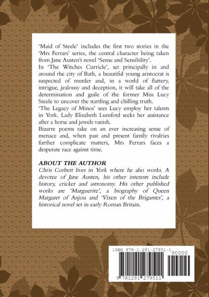 'Maid of Steele' includes the first two stories in the 'Mrs Ferrars' series, the central character being taken from Jane Austen's novel 'Sense and Sensibility'. In 'The Witches Curricle', set principally in and around the city of Bath, a beautiful young aristocrat is suspected of murder and, in a world of flattery, intrigue, jealousy and deception, it will take all of the determination and guile of the former Miss Lucy Steele to uncover the startling and chilling truth. 'The Legacy of Minos' sees Lucy employ her talents in York. Lady Elizabeth Lunsford seeks her assistance after a horse and jewels vanish. Bizarre poems take on an ever increasing sense of menace and, when past and present family rivalries further complicate matters, Mrs Ferrars faces a desperate race against time.