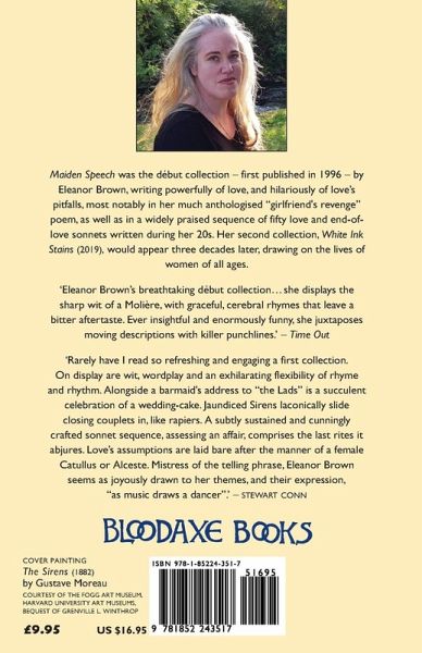 Maiden Speech is the debut collection from a witty new poet, Eleanor Brown, who writes powerfully of love, and hilariously of love's pitfalls. Her work has appeared in various magazines and anthologies. She received a Gregory Award in 1993 frnm the Society of Authors.