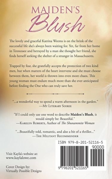 Katrina is on the run, but when a blizzard unexpectedly strands her, she never could have imagined the icy turn her life was about to take. Lost in the midst of a snowstorm, she finds refuge with a billionaire, but little does she know that this chance encounter would ignite a passionate holiday romance and a heart-wrenching love triangle. Enter Jack, the enigmatic billionaire, whose life has been defined by power and wealth. Drawn to Katrina's vulnerability and innocence, he offers her shelter from the storm, and soon their connection deepens beyond the glistening snowflakes outside. As the holiday season unfolds, their chemistry sparks a whirlwind of emotions, and they find themselves falling headlong into a love neither expected. However, fate has a different plan in store when Eric, Jack's charming best friend, enters the picture. Katrina is torn between the magnetic pull of Eric's charisma and the genuine connection she shares with Jack. With each passing day, the love triangle becomes more intricate, and choices must be made. As the snow falls and passions rise, Katrina finds herself navigating a heart-wrenching dilemma, torn between two very different men. Each offers a love she never knew she needed, but Katrina must find the ultimate love of all. Maiden's Blush is a sweet romance illustrating the transformative power of the holiday season.