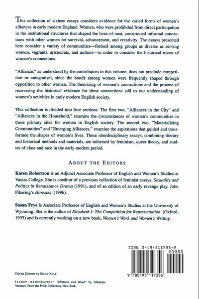 This collection of sixteen essays considers evidence for the array of women's alliances in early modern England. The inclusions range over a variety of communities, households, and court -- and consider classes of women from vagabonds to queens to explore the traces of women's connections.These clear and Lively interdisciplinary essays, combining literary and historical methods and materials, are informed by feminism, queer theory, and studies of racer in the early modern period.