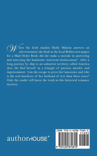 When the Irish maiden Molly Malone answers an advertisement she finds in the local Belfast newspaper for a Mail Order Bride did she make a mistake in answering and marrying the handsome American businessman? After a long journey by ship to an unknown territory called America does she find herself in a triangle of passion, murder, and imprisonment. Can she escape to prove her innocence and who is the real murderer of her husband of less than three years? Only the reader will know the truth in this historical romance mystery.