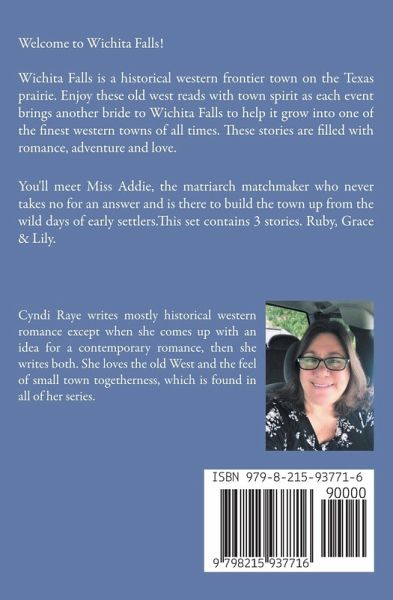 Welcome to Wichita Falls! Wichita Falls is a historical western frontier town on the Texas prairie. Enjoy these old west reads with town spirit as each event brings another bride to Wichita Falls to help it grow into one of the finest western towns of all times. These stories are filled with romance, adventure and love. You'll meet Miss Addie, the matriarch matchmaker who never takes no for an answer and is there to build the town up from the wild days of early settlers.This set contains 3 stories. Ruby, Grace & Lily.