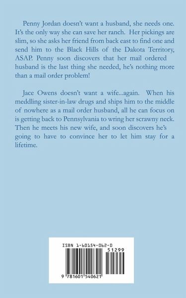 Penny Jordan doesn't want a husband- she needs one. It's the only way she can save her ranch. Her pickings are slim, so she asks her friend from back east to find one and send him to the Black Hills of the Dakota Territory, ASAP. Penny soon discovers that her mail ordered husband is the last thing she needed- he's nothing more than a mail order problem! Jace Owens doesn't want a wife-again. When his meddling sister-in-law drugs and ships him to the middle of nowhere as a mail order husband, all he can focus on is getting back to Pennsylvania to wring her scrawny neck. Then he meets his new wife, and soon discovers he's going to have to convince her to let him stay-for a lifetime.