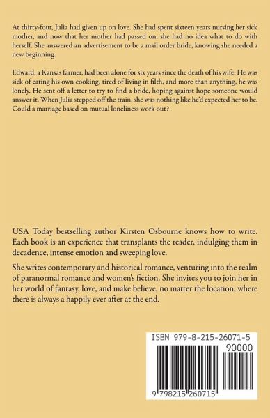 At thirty-four, Julia had given up on love. She had spent sixteen years nursing her sick mother, and now that her mother had passed on, she had no idea what to do with herself. She answered an advertisement to be a mail order bride, knowing she needed a new beginning. Edward, a Kansas farmer, had been alone for six years since the death of his wife. He was sick of eating his own cooking, tired of living in filth, and more than anything, he was lonely. He sent off a letter to try to find a bride, hoping against hope someone would answer it. When Julia stepped off the train, she was nothing like he'd expected her to be. Could a marriage based on mutual loneliness work out?