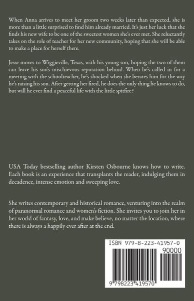 When Anna arrives to meet her groom two weeks later than expected, she is more than a little surprised to find him already married. It's just her luck that she finds his new wife to be one of the sweetest women she's ever met. She reluctantly takes on the role of teacher for her new community, hoping that she will be able to make a place for herself there. Jesse moves to Wiggieville, Texas, with his young son, hoping the two of them can leave his son's mischievous reputation behind. When he's called in for a meeting with the schoolteacher, he's shocked when she berates him for the way he's raising his son. After getting her fired, he does the only thing he knows to do, but will he ever find a peaceful life with the little spitfire?