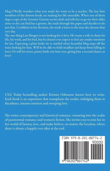 Meg O'Reilly wonders what ever made her want to be a teacher. The last four members of the demon horde are making her life miserable. When one of them slaps a copy of the Grooms' Gazette on her desk and tells her to go see their older sister so she can find her a groom, she reads through the paper and decides to do just that. Confident in her decision, she sends a letter to the man she chooses that very day. The one thing Lars Borgen is not looking for is love. He wants a wife to share his life, his work, and his bed, but he doesn't ever expect to feel any tender emotions for her. Expecting a…mehr