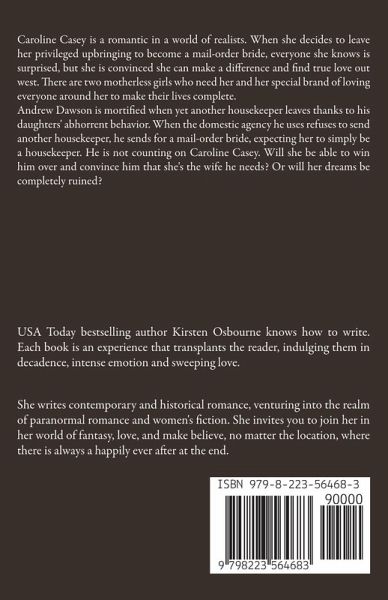 Caroline Casey is a romantic in a world of realists. When she decides to leave her privileged upbringing to become a mail-order bride, everyone she knows is surprised, but she is convinced she can make a difference and find true love out west. There are two motherless girls who need her and her special brand of loving everyone around her to make their lives complete. Andrew Dawson is mortified when yet another housekeeper leaves thanks to his daughters' abhorrent behavior. When the domestic agency he uses refuses to send another housekeeper, he sends for a mail-order bride, expecting her to simply be a housekeeper. He is not counting on Caroline Casey. Will she be able to win him over and convince him that she's the wife he needs? Or will her dreams be completely ruined?
