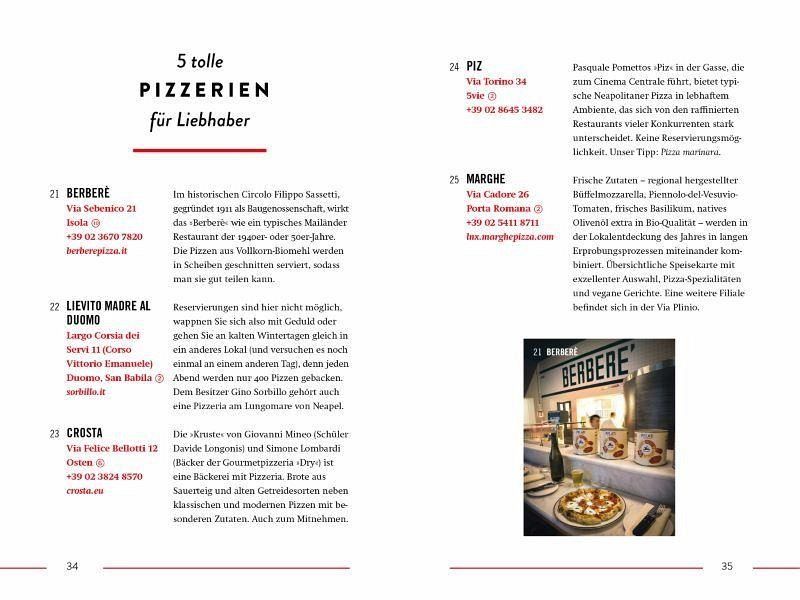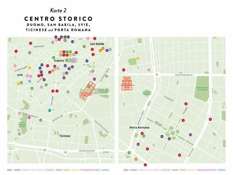 85 Orte, um gutes Essen zu genießen oder zu kaufen60 Orte für einen Drink40 Orte zum Shoppen55 Orte für Fashion & Design30 Bauwerke zum Staunen60 Orte, um Mailand zu entdecken60 Orte für den Kulturgenuss25 Orte für Kinder25 Orte zum Übernachten35 Aktivitäten fürs Wochenende25 Willkürliche Fakten und Details