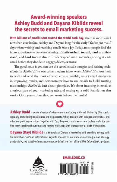 Award-winning speakers and faculty Ashley Budd and Dayana Kibilds reveal the secrets to email marketing success Email is far from dead. With billions of emails sent to and from individuals around the world each day, there is more email now than ever before. Authors Ashley Budd and Dayana Kibilds long for the early "You've got mail!" days of email when writing and receiving messages was a joy. Today, readers describe their inbox experience as an overwhelming time suck. Mailed It! acknowledges that most emails are hard to read, hard to understand, and hard to care about. Readers spend mere seconds glancing at each email before they decide to engage, delete, or worse! The good news is that humans are predictable, and you can use tested email strategies and writing techniques to overcome modern inbox woes. Mailed It! changes everything by ¿ showing how to craft and send the most effective emails possible, ¿ assisting email marketers in improving results, ¿ demonstrating how to use emails to build trusting relationships. Mailed It! isn't about gimmicks. It's about investing in email as a serious part of your marketing mix and setting up a solid foundation that works. Once you've done that, you won't believe the results.