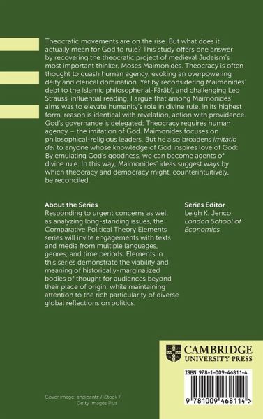 Theocratic movements are on the rise. But what does it actually mean for God to rule? This Element offers one answer by recovering the theocratic project of medieval Judaism's most important thinker, Moses Maimonides. Theocracy is often thought to quash human agency, evoking an overpowering deity and clerical domination. Yet by reconsidering Maimonides' debt to the Islamic philosopher al-F¿r¿b¿, and challenging Leo Strauss' influential reading, the author argues that among Maimonides' aims was to elevate humanity's role in divine rule. In its highest form reason is identical with revelation, action with providence. God's governance is delegated: theocracy requires human agency-the imitation of God. Maimonides focuses on philosophical-religious leaders. But he also broadens imitatio dei to anyone whose knowledge of God inspires love of God: by emulating God's goodness, we can become agents of divine rule. In this way, Maimonides' ideas suggest ways by which theocracy and democracy might, counter-intuitively, be reconciled. This title is also available as open access on Cambridge Core.