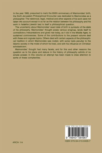 In the year 1985, presumed to mark the 850th anniversary of Maimonides' birth, the Sixth Jerusalem Philosophical Encounter was dedicated to Maim onides as philosopher. We did not enter into the other aspects of his work, rabbinical, legal, medical, etc., except in so far as the relation between his philosophy and his work in halakha (Jewish law) is itself a philosophical question. That no one is quite certain about Maimonides' date of birth is symbolic of the state of his philosophy as well. Maimonides' thought poses various enigmas, lends itself to contradictory interpretations and gives rise today, as it did in the Middle Ages, to sustained controversies. Some of the contribu tions to the present volume deal with these and cognate topics. Others deal with certain aspects of the philosophical tradition in which Maimonides was rooted, with some traits peculiar to the Islamic society in the midst of which he lived, and with his influence on Christian scholasticism. Maimonides' thought had many facets, and for this and other reasons the question as to his place and stature in the history of philosophy admits of no simple answer. In this volume an attempt has been made to draw atten tion to some of these complexities.