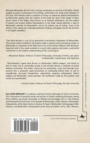 Although Maimonides did not write a running commentary on any book of the Bible, biblical exegesis occupies a central place in his writings, particularly in his Guide of the Perplexed. In this book, Sara Klein-Braslavy offers a collection of essays on several key biblical interpretations by Maimonides dealing with the creation of the world; the story of the Garden of Eden; Jacob's dream of the ladder; King Solomon as an esoterist philosopher; and the problem of exoteric and esoteric biblical interpretations in the Guide. Special attention is paid to Maimonides' methods of interpretation and to his esoteric way of writing. Some of the articles in this volume were originally published in Hebrew, and appear here for the first time in English.