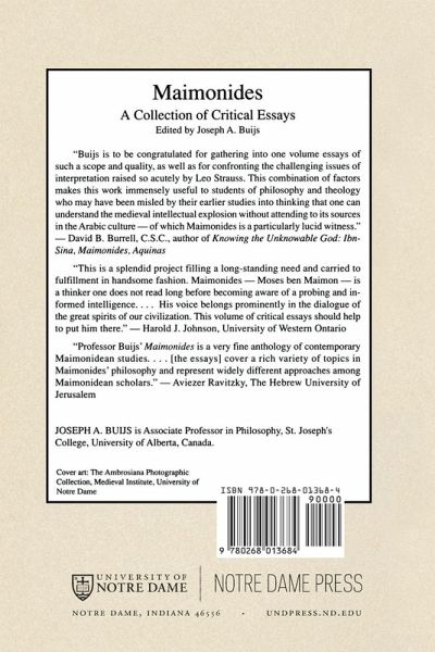 "Buijs is to be congratulated for gathering into one volume essays of such a scope and quality, as well as for confronting the challenging issues of interpretation raised so acutely by Leo Strauss. This combination of factors makes this work immensely useful to students of philosophy and theology who may have been misled by their earlier studies into thinking that one can understand the medieval intellectual explosion without attending to its sources in the Arabic culture--of which Maimonides is a particularly lucid witness."-David B. Burrell, C.S.C. "This is a splendid project filling a long-standing need and carried to fulfillment in handsome fashion. Maimonides--Moses ben Maimon--is a thinker one does not read long before becoming aware of a probing and informed intelligence. . . . His voice belongs prominently in the dialogue of the great spirits of our civilization. This volume of critical essays should help to put him there." -Harold J. Johnson, University of Western Ontario "Professor Buijis' Maimonides is a very fine anthology of contemporary Maimonidean studies. . . . [the essays] cover a rich variety of topics in Maimonides' philosophy and represent widely different approaches among Maimonidean scholars." -Aviezer Ravitzky, The Hebrew University of Jerusalem