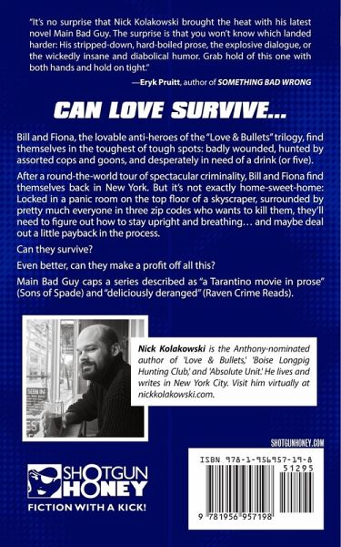 Bill and Fiona, the lovable anti-heroes of the "Love & Bullets" trilogy, find themselves in the toughest of tough spots: badly wounded, hunted by assorted cops and goons, and desperately in need of a drink (or five). After a round-the-world tour of spectacular criminality, Bill and Fiona find themselves back in New York. But it's not exactly home-sweet-home: Locked in a panic room on the top floor of a skyscraper, surrounded by pretty much everyone in three zip codes who wants to kill them, they'll need to figure out how to stay upright and breathing... and maybe deal out a little payback in the process. Can they survive? Even better, can they make a profit off all this? Main Bad Guy caps a series described as "a Tarantino movie in prose" (Sons of Spade) and "deliciously deranged" (Raven Crime Reads). Praise for MAIN BAD GUY: "It's no surprise that Nick Kolakowski brought the heat with his latest novel Main Bad Guy. The surprise is that you won't know which landed harder: His stripped-down, hard-boiled prose, the explosive dialogue, or the wickedly insane and diabolical humor. Grab hold of this one with both hands and hold on tight." -Eryk Pruitt, author of Townies and What We Reckon